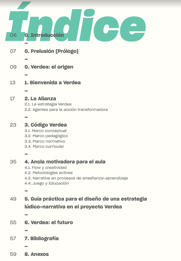 1. Camino de retorno: ya sí, con el camino encontrado cobró vida el índice a través del orden natural: inicio, nudo y desenlace. O lo que es lo mismo, se plantea el conflicto a resolver (Ardeve está robando los recursos de la nuestro planeta), la estrategia para superarlo junto al código de comunicación entre los agentes implicados (Alianza Verdea y su apuesta por un ancla lúdico-narrativa) y el desenlace práctico (diseño lúdico narrativo y «futuro) a través de la guía.