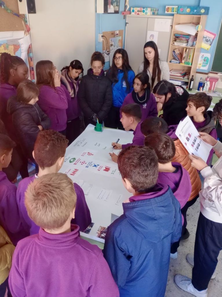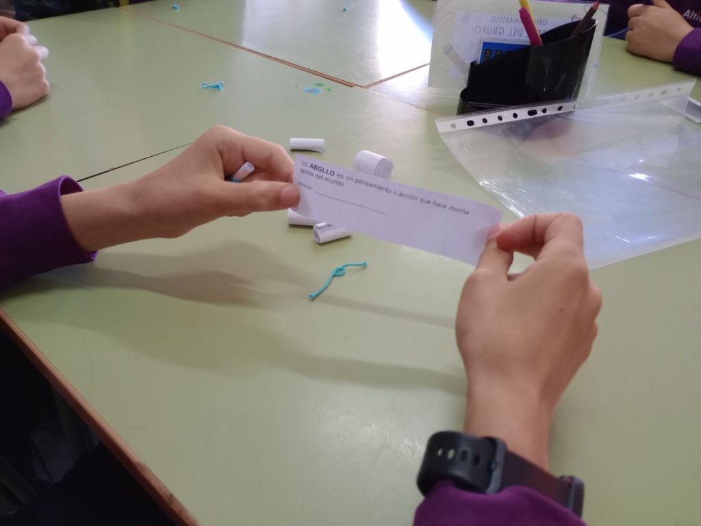 Por último, el tercer grupo tuvo que resolver una serie de anagramas sobre palabras clave de los distintos ejes que se habían trabajado en las sesiones anteriores. Esto les permitió repasar y recordar las ideas principales de cada uno de los ejes de justicia global.