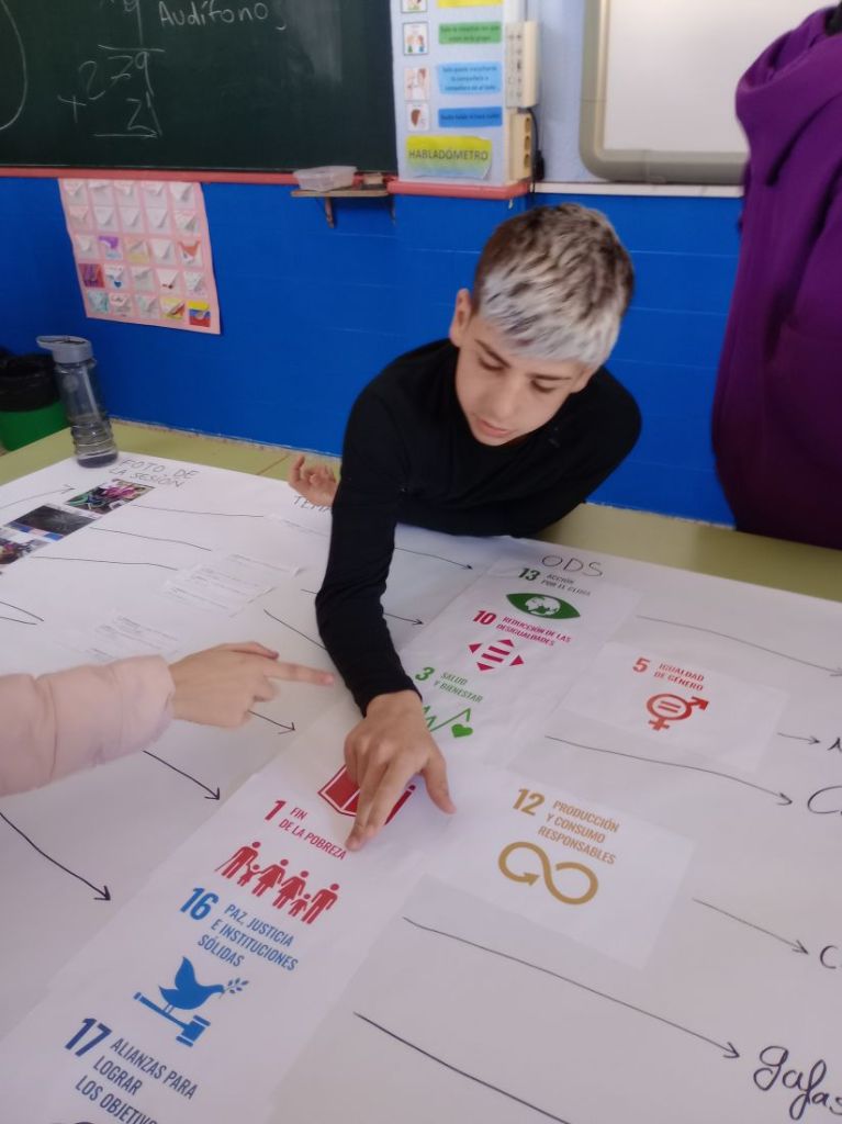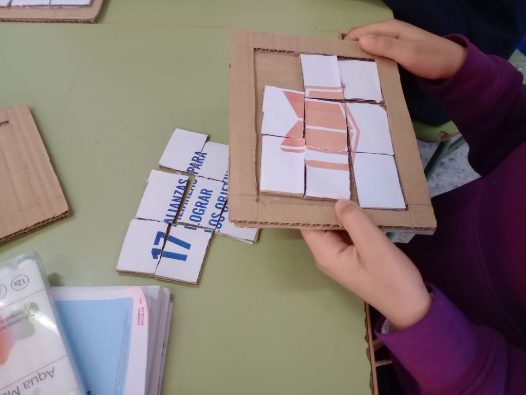 El primer grupo tuvo la tarea de realizar un puzzle con distintas piezas cuadradas, pero no era un puzzle al uso, la misión era construir la imagen deslizando las piezas en vertical y horizontal pero sin levantarlas. En las imágenes tenían que reconocer cada uno de los ODS trabajados durante toda la fase de sensibilización.