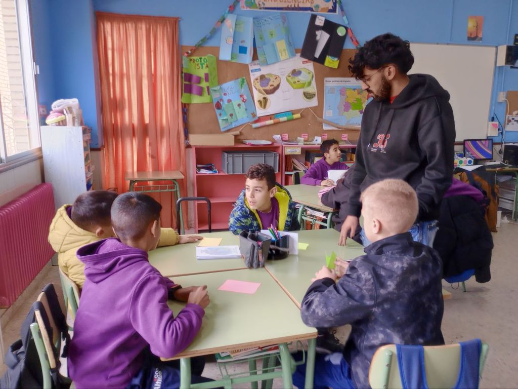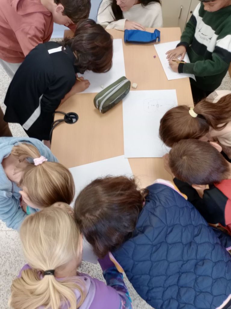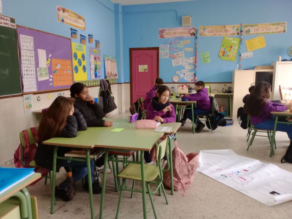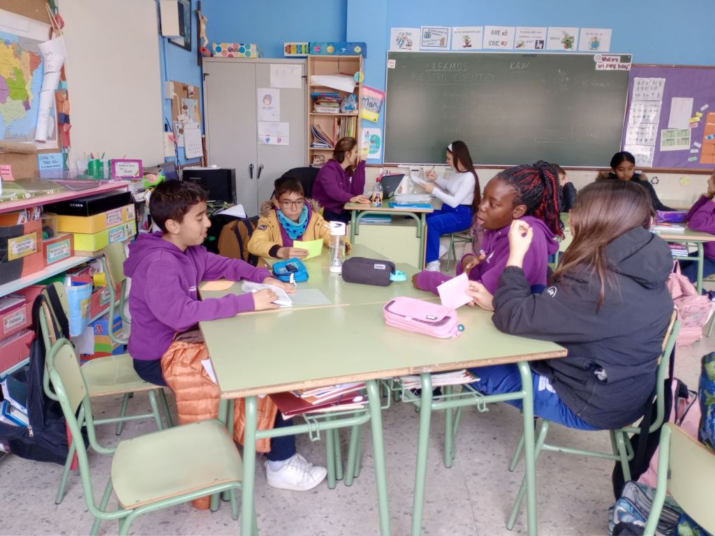 En la primera parte de la sesión el alumnado ideó un pequeño relato para calentar los motores. Se pusieron cuatro papeles de colores en el centro de la mesa, cada papel correspondía a un ítem diferente para el que tenían un tiempo concreto. El papel verde correspondía a los personajes protagonistas y antagonistas, el papel amarillo la temática que más les ha llamado la atención durante el proyecto, el papel naranja las acciones que suceden y el papel blanco el escenario donde ocurre todo.  Cada grupo de mesa trabajó en conjunto para unir todas las ideas y crear una propuesta única.