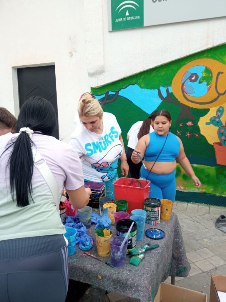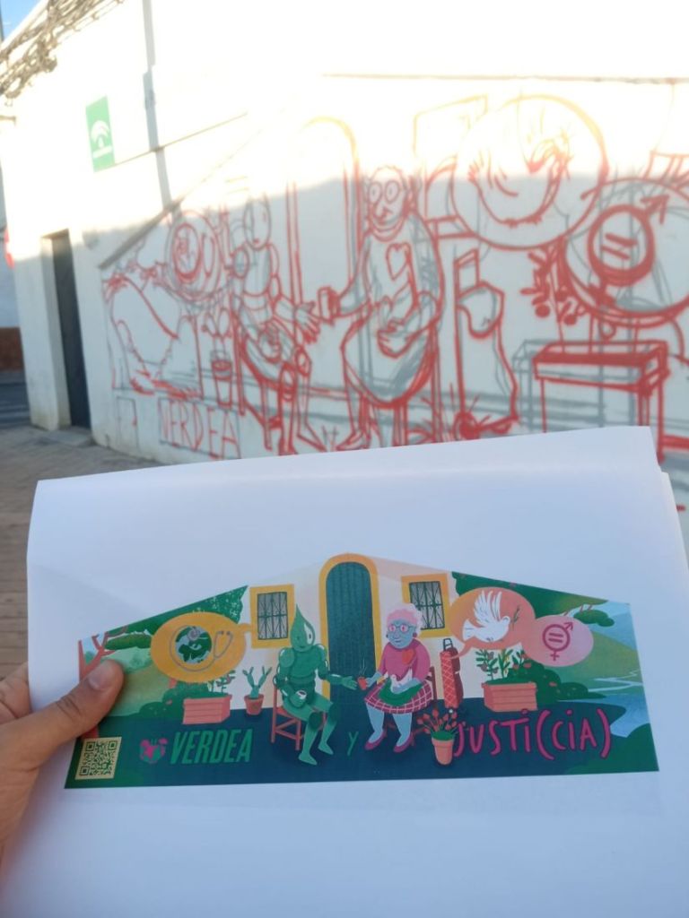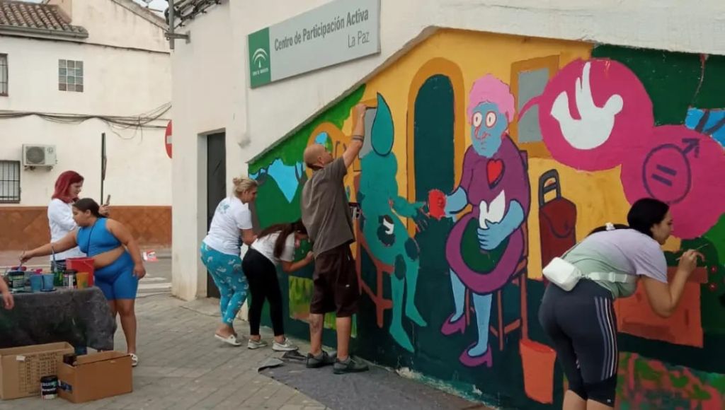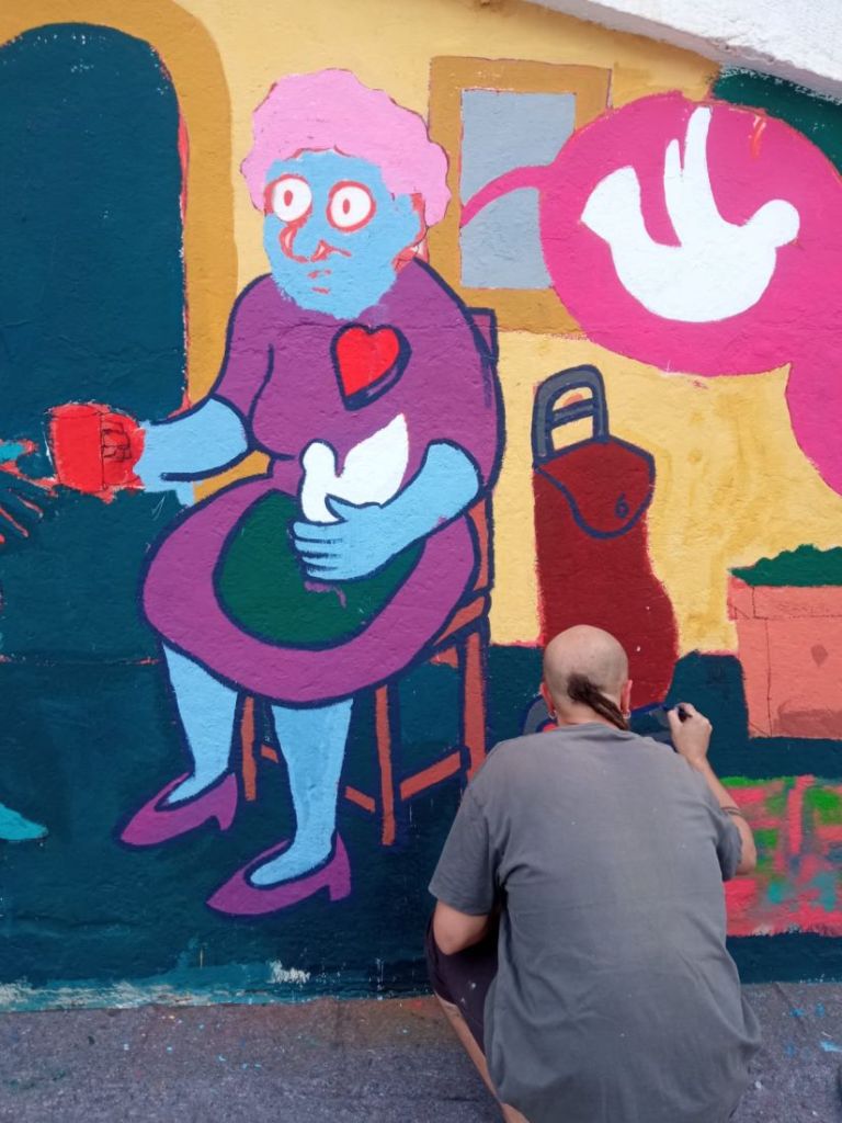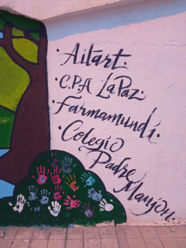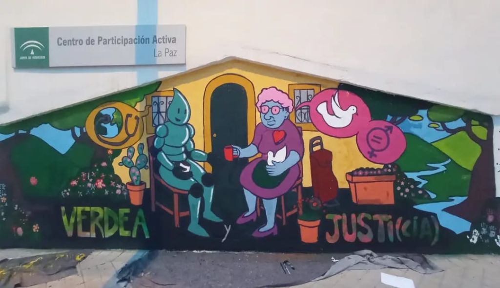 Esta ilustración ha sido creada por Cristian Pineda y adaptada para la pared por Ait Artist, quien además de delinear la pared ha estado 3 días dinamizando el espacio para que jóvenes, personas del barrio y las mujeres mayores del CPA La Paz pudieran pintarlo conjuntamente.