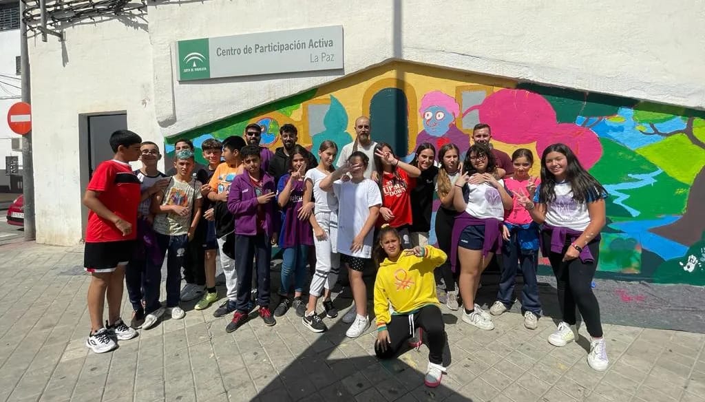 Esta ilustración ha sido creada por Cristian Pineda y adaptada para la pared por Ait Artist, quien además de delinear la pared ha estado 3 días dinamizando el espacio para que jóvenes, personas del barrio y las mujeres mayores del CPA La Paz pudieran pintarlo conjuntamente.